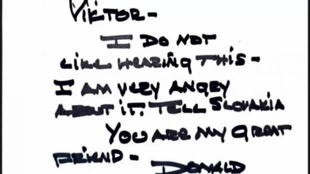 "I don't like hearing that. I am very angry about this. Tell Slovakia about it. You are my great friend," it says on the sheet with Donald Trump's signature.