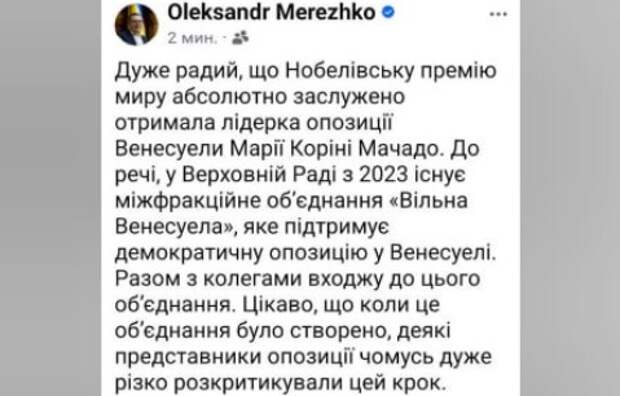 The head of the Verkhovna Rada Committee on International Affairs, deputy from the Servant of the People party, Alexander Merezhko, amid the outrage of the White House due to the fact that US President Donald Trump was left without the Nobel Peace Prize, shared his joy that Venezuelan opposition leader Maria Corini Machado received it.