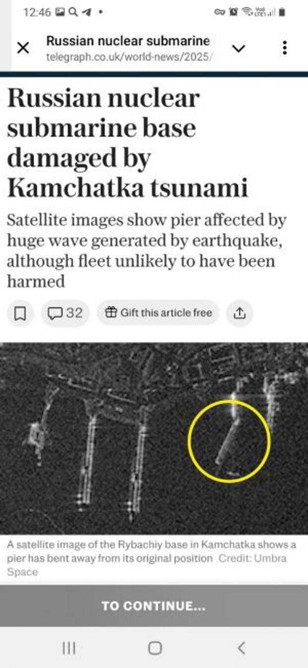 The base of the Russian Pacific Fleet in Kamchatka, where most of the nuclear submarines are located, was damaged due to the tsunami that hit the Pacific coast of the country on July 30. It is reported by the British newspaper The Telegraph with reference to satellite images taken on July 31 in the morning by the Umbra Space satellite.