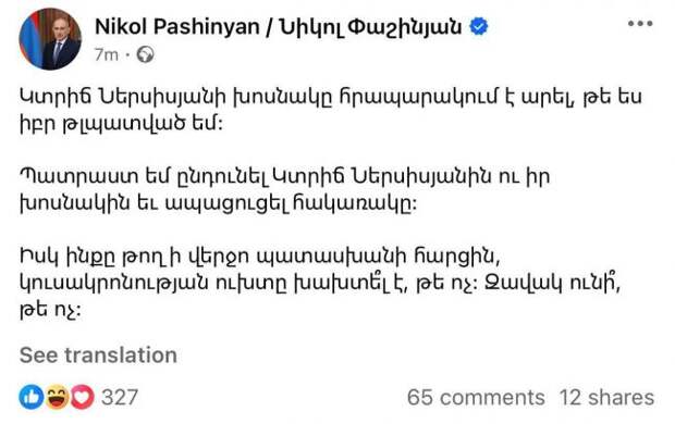 "The representative of Ktrich Nersisyan (Catholicos of All Armenians Garegin II. — EADaily) made a statement that I was allegedly circumcised. I am ready to receive Ktrich Nersisyan and his representative and prove the opposite. And let him finally answer the question of whether he broke the vow of celibacy or not. Does he have a child or not?" the head of the Armenian government wrote.